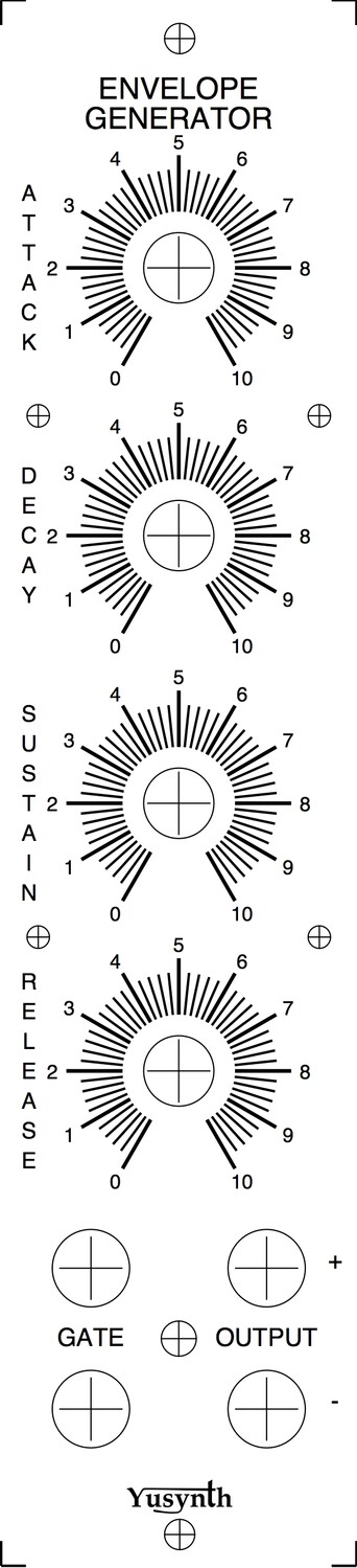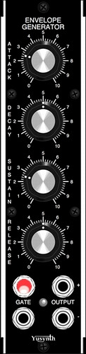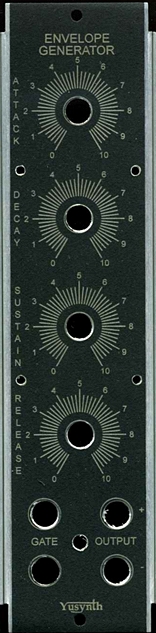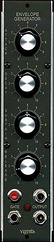 Этот модуль имеет вход GATE. Сигнал GATE определяет начало и длительность сигнала огибающей. Четыре параметра можно установить с помощью потенциометров: