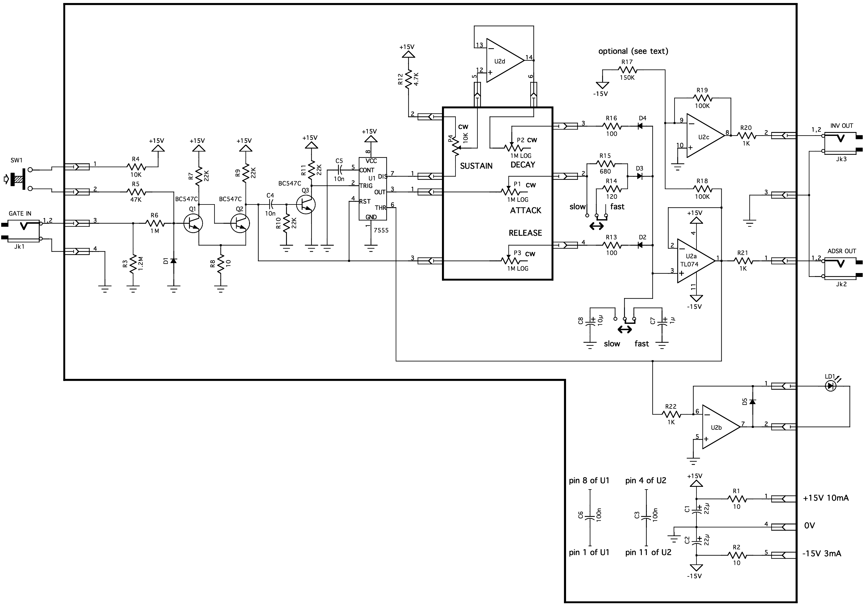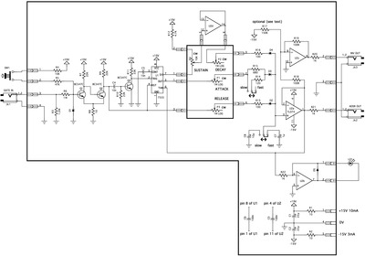 Транзисторы Q1 и Q2 работают как триггеры Шмитта и преобразуют любой входной сигнал в подходящий сигнал GATE. Диод D1 защищает схему от отрицательных напряжений. Порог срабатывания триггера составляет 2 В. Диоды D2–D4 используются для управления током заряда и разряда конденсаторов C7/C8 ( танталовый конденсатор 10 мкФ/35 В) через потенциометры P1, P2 и P4. Микросхема 7555 (U1) подключена как одновибратор. Один операционный усилитель (TL074) используется для буферизации напряжения SUSTAIN и предотвращения помех настройкам DECAY (в противном случае время DECAY будет зависеть от уровня SUSTAIN) . Два операционных усилителя используются в качестве простого повторителя напряжения и инвертора напряжения соответственно. Четвертый операционный усилитель управляет светодиодом управления. Обратите внимание, что диод J1 (BS170) был введен для разрыва цепи DECAY, когда сигнал GATE возвращается к 0 В до завершения цикла DECAY. Это гарантирует, что конденсатор будет разряжаться через потенциометр RELEASE, а не через схему DECAY. Насколько мне известно, это предпочтительное поведение для клавишников...