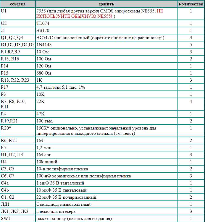 Схема этого модуля довольно проста и использует очень распространенные компоненты. В основе схемы лежит микросхема 555, созданная на основе оригинальной идеи Джонатана Джеки   , опубликованной в журнале Electronics (« Двухчиповый генератор формирует звуки синтезатора », Electronics № 11, сентябрь 1980 г.: 137-138). Эта микросхема вдохновила других любителей самодельных устройств (Тома Г.-ЭФМ, Рене Шмитца).