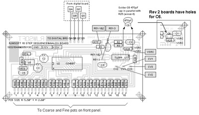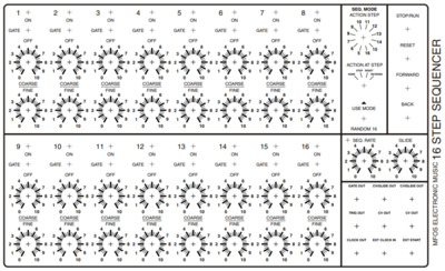 | Функции -Улучшенная печатная плата (гораздо меньше кустарных работ) -Создает последовательности длиной от 4 до 16 шагов. -Включает в себя следующие режимы: остановка по счету, реверс по счету, сброс по счету и режим случайного числа 16. -Каждый этап имеет грубую и точную настройку, а также переключаемый затвор. -Принимает внешний тактовый сигнал и внешний пусковой импульс. -Одновременный вывод с портаменто и без него. -Элементы управления «Вперед», «Назад» и «Сброс» упрощают настройку последовательности. -Примерное потребление тока: +12 В (21,7 мА) -12 В (10,5 мА)