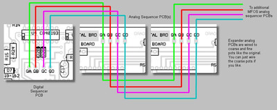 С одной цифровой платы можно управлять несколькими аналоговыми платами секвенсора. Это достигается путем последовательного соединения контактов QA, QB, QC и QD от цифровой платы секвенсора к одной или нескольким дополнительным аналоговым платам секвенсора. На иллюстрации ниже это показано. Каждая дополнительная аналоговая плата требует собственного набора регуляторов грубой и точной настройки, а также нового набора выходных разъемов CV и регулятора портаменто. Они устанавливаются на панели и подключаются так же, как и оригинальный набор регуляторов грубой/точной настройки, выходных разъемов CV и регулятора портаменто.