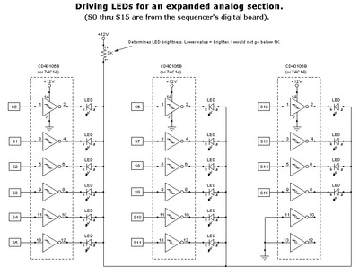 Хотя, вероятно, можно обойтись и дополнительным набором светодиодов, подключенных параллельно к исходным, я рекомендую изолировать исходную схему управления и добавить буферы того или иного типа к каждому набору новых светодиодов. Ниже я показываю три разных способа управления индикаторными светодиодами расширенной аналоговой секции. Один способ использует NPN-транзисторы в качестве буферов, другой — шестиканальные инвертирующие триггеры Шмитта (CD40106), и, наконец, решение на одном чипе — использование CD4514 (CMOS 4-разрядный защелкивающий транзистор/декодер 4-в-16 линий). Оба варианта будут работать нормально, и любой из них можно собрать на небольшой дочерней плате. Выбор может зависеть от того, что есть у вас в шкафу с компонентами: транзисторы, инверторы или запасной CD4514.