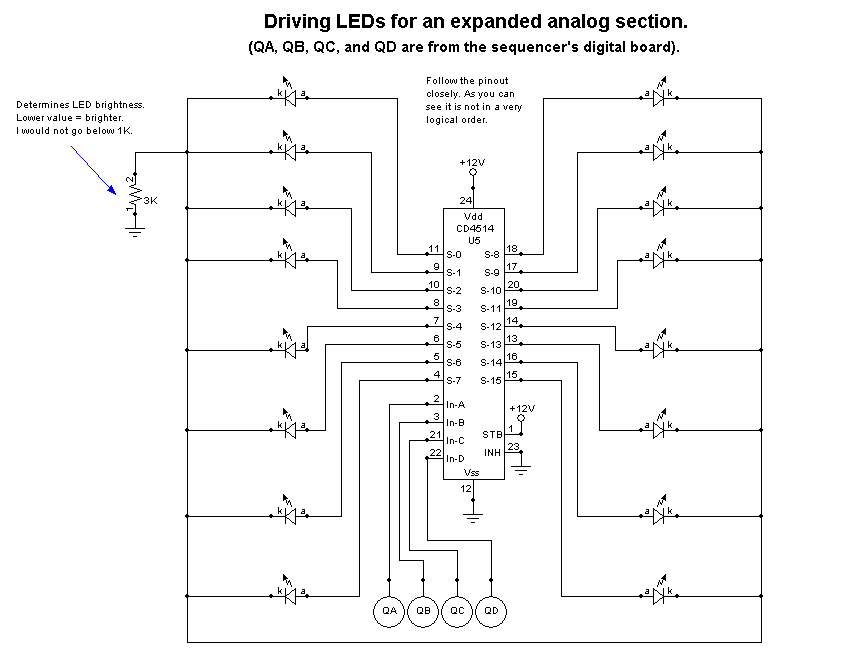 Наконец, это метод с использованием CD4514. Он использует один чип, и обратите внимание, что для его управления используются входы QA-QD. Они поступают с аналоговой платы и, скорее всего, их потребуется припаять к контактным площадкам QA-QD на плате.