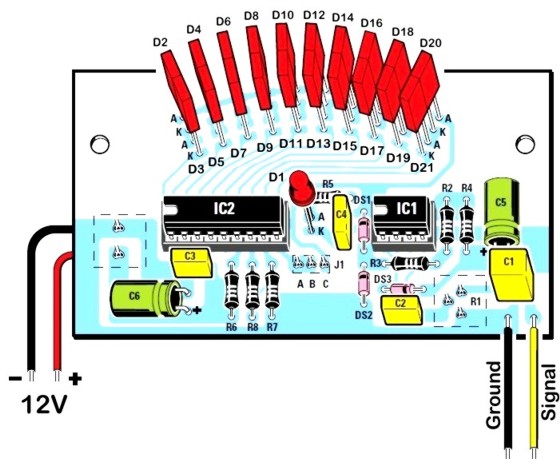 Ce vumètre est un classique du genre, puisque basé sur le LM3916 qui une variante "audio" des célèbres LM3914 et LM3915.