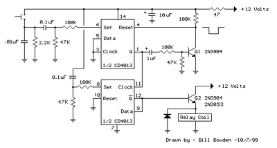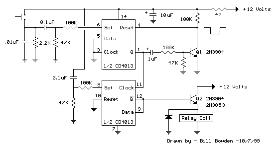 Описание: Схема использует двухканальный D-триггер CMOS (CD4013) для переключения реле или другой нагрузки с помощью кратковременной кнопки. Несколько кнопок могут быть соединены параллельно для управления реле из разных мест. Высокий сигнал с кнопки подается на линию установки через небольшой конденсатор (0,1 мкФ). Высокий сигнал с выхода Q инвертируется верхним транзистором, обеспечивая низкий сигнал сброса на линии сброса в течение приблизительно 400 мс. По истечении этого времени линия сброса возвращается в высокое состояние, сбрасывая триггер. Нижняя секция триггера настроена на переключение, изменяя состояние по восходящему фронту тактовой линии или одновременно с переходом верхнего триггера в состояние установки. Дребезг контактов снижается из-за короткой длительности сигнала установки по сравнению с большей длительностью до сброса схемы. Выходы Q или Q-bar могут обеспечивать ток не более 2 мА; Таким образом, для управления катушкой реле, лампой или другой нагрузкой необходим буферный транзистор или силовой MOSFET. Для сопротивления катушки реле 250 Ом и более подходит транзистор 2N3904 или любой малосигнальный NPN-транзистор, а для сопротивления катушки ниже 250 Ом рекомендуется использовать 2N3053 или транзистор средней мощности (500 мА). Резистор 47 Ом и конденсатор 10 мкФ развязывают схему от источника питания и фильтруют любые переходные шумовые сигналы. RC-цепь (0,1/47 кОм) на линии SET (вывод 8) действует как сброс при включении питания, гарантируя, что реле останется обесточенным при первоначальном включении питания.