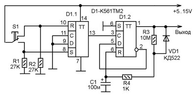 Собственно таймер сделан на триггере D1.2,а на триггере D1.1 выполнено устройство его запуска. При нажатии-отпускании на кнопку S1 триггер D1.1 формирует один импульс. Применение триггера для запуска дает возможность полностью избежать сбоев от дребезга контактов кнопки, и одно нажатие – отпускание кнопки формирует только один импульс на выходе D1.1. Этот импульс поступает на синхровход триггера D1.2 (на вывод 3). При этом триггер D1.2 устанавливается в то состояние, которое есть на его входе данных (вывод 5). Так как исходным для данного триггера является нулевое состояние, то на его инверсном выходе имеется логическая единица, и, так как этот выход соединен с выводом 5, триггер устанавливается в единичное состояние. На выходе схемы появляется логическая единица. Далее начинается отсчет времени, происходящий за счет зарядки емкости конденсатора С1 через резисторы R3 и R4. Завершается отсчет тем, что С1 заряжается до высокого логического уровня, и это возвращает триггер в нулевое состояние, так как напряжение с С1 поступает на его обнуляющий вывод 6. Особенность данного таймера в том, что остановить отсчет времени и вернуть таймер в нулевое состояние на выходе можно в любой момент отсчитываемого времени. Для этого нужно повторно нажать кнопку S1. Допустим, идет отсчет времени. На выходе D1.2 единица. Следовательно на инверсном выходе D1.2 будет ноль. А инверсный выход триггера соединен с входом данных. Поэтому, нажатие кнопки S1 во время отсчета времени приведет к тому, что триггер установится в нулевое положение. А не успевший еще зарядиться до логической единицы конденсатор С1 разрядится через диод VD1 и резистор R4.