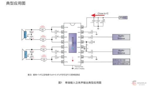 CS86552E имеет встроенную защиту от перегрузки по току, короткого замыкания и перегрева, что эффективно защищает микросхему от повреждений в ненормальных условиях эксплуатации. CS86552E может работать с акустическими системами с нагрузкой всего 4 Ом и обеспечивать непрерывную мощность до 2x20 Вт; КПД CS86552E достигает 90%, поэтому при воспроизведении музыки не требуется дополнительный радиатор.