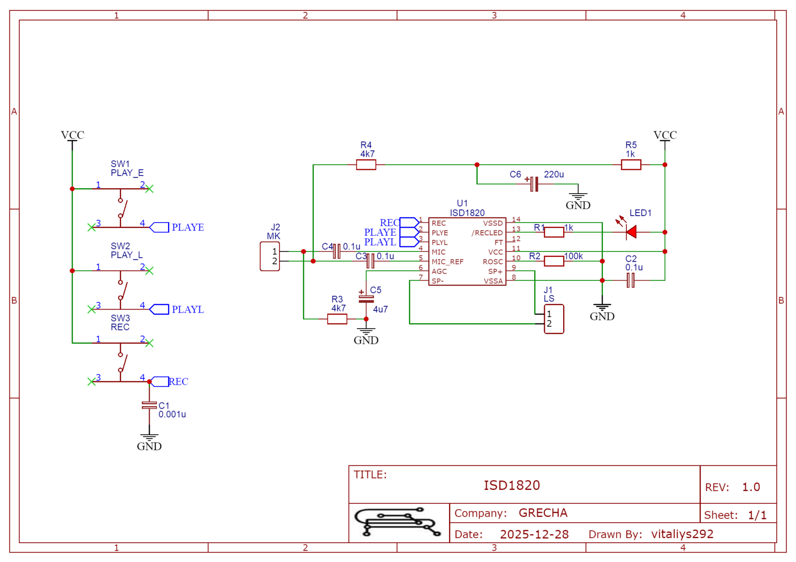 ISD1820 для записи и воспроизведения одного голосового сообщения длиной до 10 секунд. Модуль включает в себя электрет...