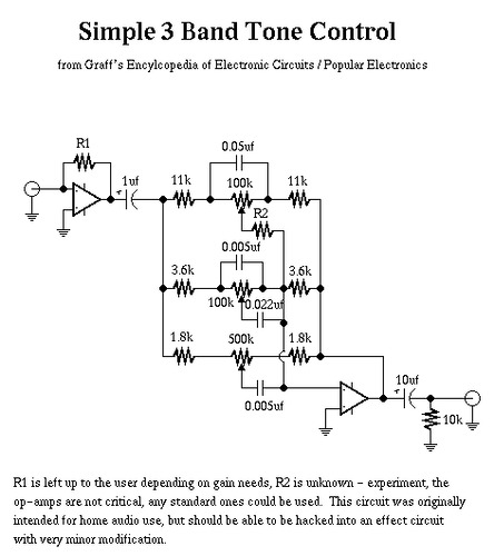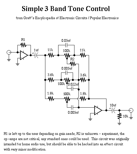 (3 Band Tone Circuit) Simple tone control from Graff`s Encyclopedia of Electronic Circuits. Could be hacked into a pedal easily.
