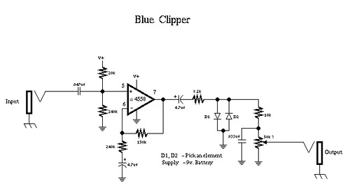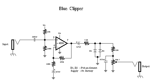 (Blue Clipper) Схема подключаемого к гитаре дисторшн-генератора от Дэна Армстронга. Это встречно-параллельный диодный ограничитель, управляемый операционным усилителем.