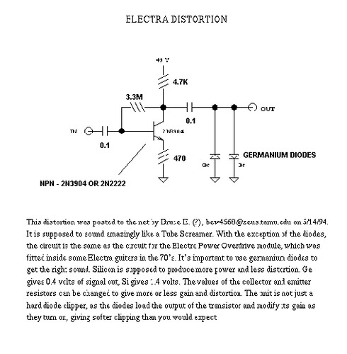 Эта схема близка к той, что когда-то использовалась в гитарах Electra для достижения перегрузки. Говорят, что звучит удивительно похоже на TS-9.