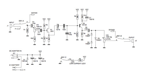 Вот хорошо звучащий овердрайв от Earthquaker Devices. Это первая версия Crimson Drive, имеющая только регуляторы уровня и усиления. Использует J201 в буферном каскаде и PNP AC128 в каскаде усиления.