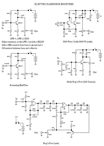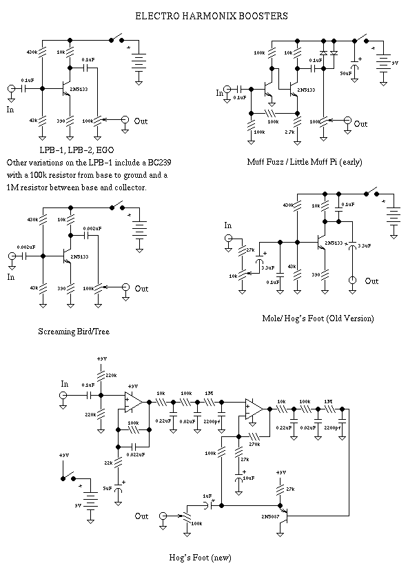 Несколько схем для Hog's Foot, Screaming Tree, LPB-1 и других простых усилителей, производимых EH.