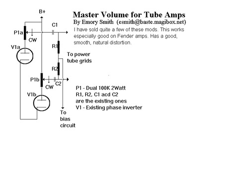 Схема регулировки громкости с использованием двойного потенциометра для двухтактных ламповых гитарных усилителей.