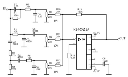 Устройство состоит из трех RC-фильтров и суммирующего их выходные напряжения инвертирующего сумматора на ОУ А1. Фильтр R1C1R5C5R7 выделяет низкочастотные составляющие сигнала, R2C3C6R8 - среднечастотные, а C2R3R4C4R6C7R9 -высокочастотные. Частоты раздела фильтров примерно 150 и 5000 Гц. Уровни сигналов, поступающих на вход ОУ А1, регулируют переменными резисторами R7 - R9.