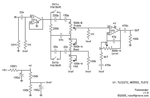 Переключатель Mid Shift (SW1 на схеме) выбирает центральную частоту провала в среднечастотном диапазоне. Центральная частота смещается примерно с 700 Гц (Marshall/Vox) до 400 Гц (Fender) в положениях HI и LO соответственно.