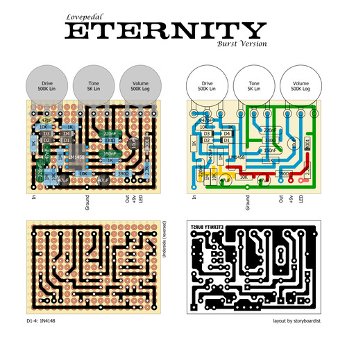 Eternity Overdrive чем-то похож на Big Muff от Lovepedal, поскольку у него есть множество различных версий (кажется, больше 10), но по сути это Tube Screamer без входных и выходных буферов. Я нарисовал здесь две версии: Black и Burst. Основное отличие между ними — каскад ограничения. У Black версии асимметричный, а у Burst — симметричный на 4 диодах. Остальные отличия заключаются лишь в незначительных изменениях номиналов.