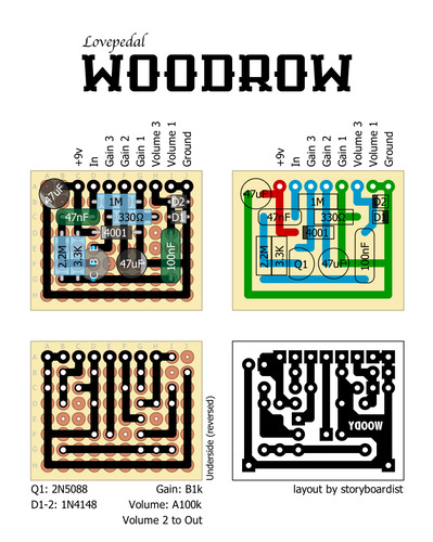 Это одна из многочисленных вариаций старого Electra Distortion. Звучит как раздолбанный усилитель Tweed 5E3. У оригинального Lovepedal Woodrow есть только ручка громкости, но легко (и удобно) добавить регулировку усиления. Если вам нужен только один регулятор, соедините Gain 3 с Gain 2.