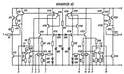 Принципиальная схема линейного усилителя (несимметричное включение микросхемы К548УН1 (А-В), Kу,U = (R3+R2)/R2 --------------------------------------------- Описание Микросхема представляет собой малошумящий двухканальный усилитель для предварительного усиления сигналов частотой до 1 МГц. Предназначена для применения в высококачественной стереофонической бытовой и студийной аппаратуре записи и воспроизведения звука, а также радиоизмерительной аппаратуре. Микросхема имеет малые шумы и нелинейные искажения, внутреннюю частотную коррекцию и защиту от коротких замыканий. Корпус типа 201.14-1. Масса не более 1,5 г. Назначение выводов: 1 — вход неинвертирующий 1 -го канала; 2—вход инвертирующий 1 -го канала; 3—общий эмиттер дифференциального каскада 1-го канала; 4—общий (-Uп); 5, 6—коррекция 1 -го канала; 7—выход 1 -го канала; 8—выход 2 -го канала; 9—питание (+Uп); 10, 11—коррекция 2 -го канала; 12—общий эмиттер дифференциального каскада 2 -го канала; 13—вход инвертирующий 2 -го канала; 14—вход неинвертирующий 2 -го канала.