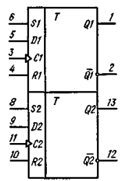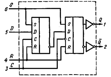 Входы R и S не зависят от импульсов синхронизации и имеют активные высокие уровни. Поступление высокого уровня на входы R или S устанавливают оба однотактных D-триггера соответственно в «0» или «1» независимо от входов D и C.