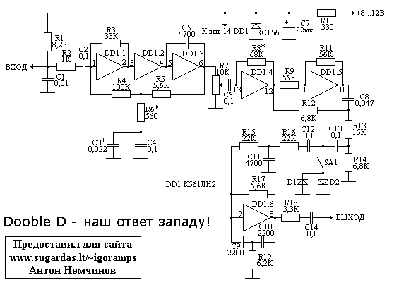 Схема имеет очень большую гибкость в формировании АЧХ. Предварительный усилитель собран на элементах DD1.1 … DD1.3 с непосредственной связью между каскадами. В этих каскадах введена основная цепь ООС (R4 и R5) и две дополнительных на R3 и C5. АЧХ формируется всеми элементами усилителя. Усиленный и скорректированный сигнал через регулятор уровня ограничения R7 поступает на первый ограничитель, собранный на DD1.4. Ограниченный сигнал прямоугольной формы преобразуется фазовращателем, выполненным на DD1.5, R12 и C8 в сигнал треугольной формы путем вычитания нечетных гармоник. С делителя R13, R14 сигнал поступает на ограничительные диоды D1 и D2 (которые можно отключить переключателем SA1), где вершины треугольника срезаются и сигнал по форме приближается к синусоидальному. Следом за ограничителем включен активный фильтр с частотой среза около 3 кГц, собранный на DD1.6. Так сказать, подобие спикерсима.