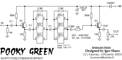 Посмотрите на рисунок. Схема предельно простая. Два буфера повторителя на транзисторах Q1 и Q2, и, собственно, сама схема исказитель. "Исказитель" интересен тем, что собран он на цифровой КМОП микросхеме! Микросхема введена в аналоговый режим подключением резисторов 3.3МОм в цепь обратной связи - между входом и выходом.