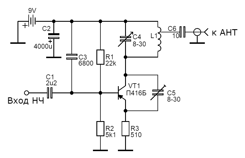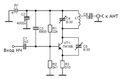 Простой УКВ ЧМ радиопередатчик на одном транзисторе (П416, ГТ313)