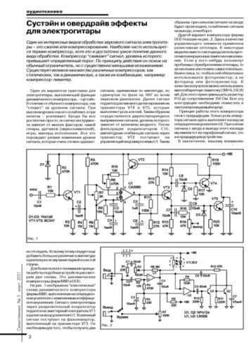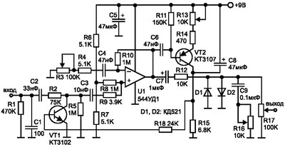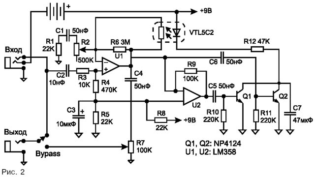 Схема не критична к типу используемых транзисторов. Желательно, чтобы VT1 был малошумящий. Из доступных это транзисторы КТ3102Е (Ж, Д). В качестве операционного усилителя подойдет и К140УД6, 7 (608, 708), правда шумы при этом немного возрастут. Схема начинает работать при уровне входного сигнала 1,5 мВ, поэтому надо уделить тщательное внимание экранированию как гитары, так и самой приставки. Даже малейший “фон” во время затухания струны станет очень заметным за счет “вытягивания” усиления сустэйном.