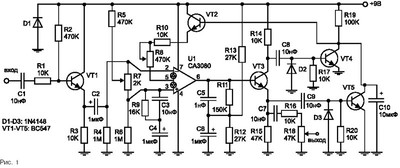 На рис. 1 изображена “классическая” схема динамического компрессора фирмы MXR, выполненная на операционном усилителе с изменяемым коэффициентом усиления. Сигнал с электрогитары через разделительный конденсатор подается на эмиттерный повторитель VT1 и далее на вход усилителя U1. Усиленный сигнал поступает на фазоинвертор, выполненный на транзисторе VT3. Он необходим для того, чтобы получить два сигнала, одинаковые по амплитуде, но сдвинутые по фазе на 180° во всем звуковом диапазоне. Далее сигнал подается для пикового детектирования на транзисторы VT4 и VT5, которые выполняют роль ключей. Таким образом осуществляется двухполупериодное выпрямление сигнала, уровень которого зависит от величины входного. После фильтрации конденсатором С10, амплитудная огибающая сигнала через транзистор VT2 поступает на управляющий вход микросхемы U1. Таким образом, при сильном сигнале на входе будет происходить ослабление сигнала на выходе, и наоборот.