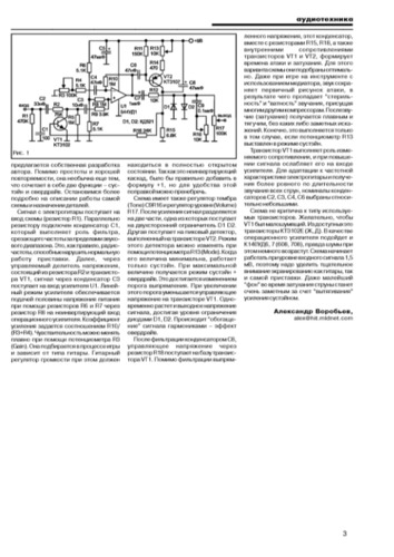 Транзистор VT1 выполняет роль изменяемого сопротивления, и при повышении сигнала ослабляет его на входе усилителя. Для адаптации к частотной характеристике электрогитары и получения более ровного по длительности звучания всех струн, номиналы конденсаторов С2, С3, С4, С6 выбраны относительно небольшими.