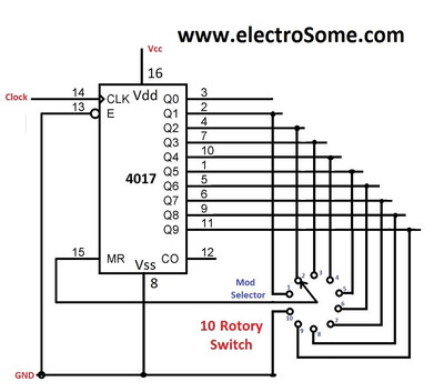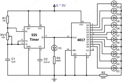 Аналогично, выводы VDD (16 - й) и VSS (8 - й) микросхемы CD4017 подключены непосредственно к источнику питания. Вход разрешения тактирования (13 - й) является активным низким входом, поэтому он подключен к земле. Вход тактирования (14 - й) подключен к выходу таймера 555. Каждый из декодированных выходных выводов (Q0 ~ Q9) подключен к светодиоду. Резистор R3 используется для ограничения тока. Для ограничения тока через все светодиоды требуется только один резистор, поскольку одновременно будет включаться только один светодиод .