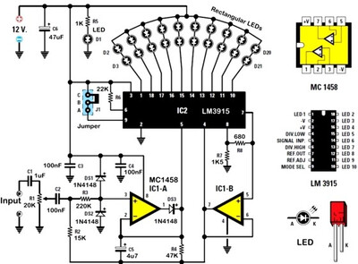 Измеритель уровня громкости собран на двух интегральных микросхемах: LM3915 и MC1458. LM3915 - это специализированная микросхема управления светодиодной линейкой с логарифмической характеристикой, а MC1458 - двухканальный операционный усилитель. Один канал операционного усилителя используется в качестве выпрямителя, а другой используется для получения опорного напряжения 4V. Выпрямитель вырабатывает постоянное напряжение, пропорциональное амплитуде входного сигнала.