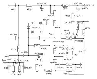 После второго каскада, преодолев конденсатор С10, сигнал (уже донельзя усиленный, а может даже искаженный) упирается в диодную цепочку VD6-8. Эта цепочка установлена так, как это делают обычно в схемах дисторшнов на операционных усилителях. Просто с выхода каскада на землю - для получения максимально возможных искажений, притом, "плотных". Она в нашей схеме реализует эффект грубого жесткого овердрайва, или даже того самого дисторшна (наподобие Proco Rat). Отличие от типовой диодной цепочки дисторшна тут только одно - она не симметричная. Отличие это не уникальное, подобный прием использован во многих схемах дисторшнов, потому что позволяет получить менее "тупое" ограничение сигнала, сделать дисторшн естественнее, однако, встречается такой вариант ограничителя, все таки, реже симметричной диодной цепи. Впрочем, несимметричные диодные цепочки в дисторшнах делают, как правило, из одинаковых диодов (кроме редких ценителей теплого диодного звука, искушенных в самых разных вариациях), в данной же схеме используются два кремниевых и один германиевый диод, что вкупе с тумблером SA2 позволяет получить только несимметричное искажение сигнала, зато в двух вариантах:
