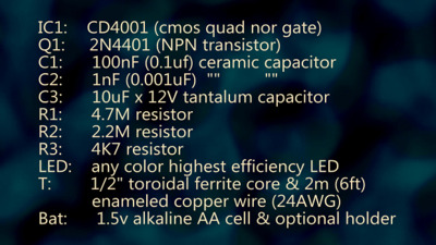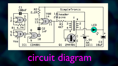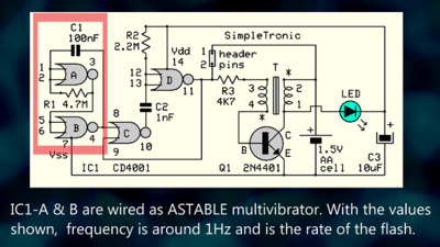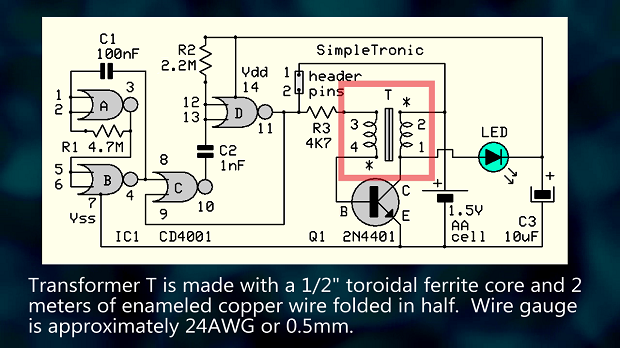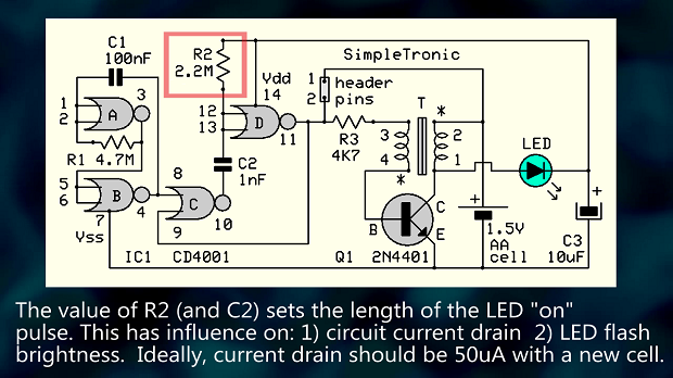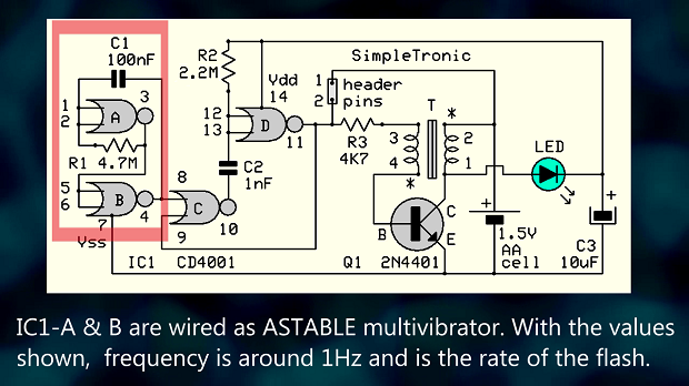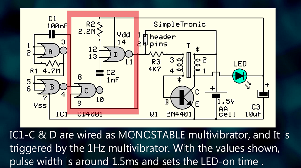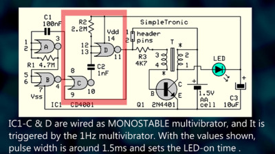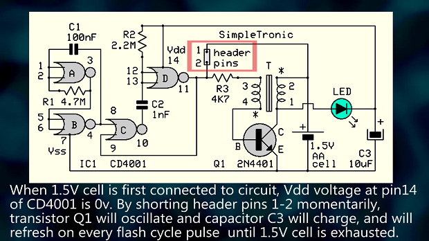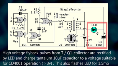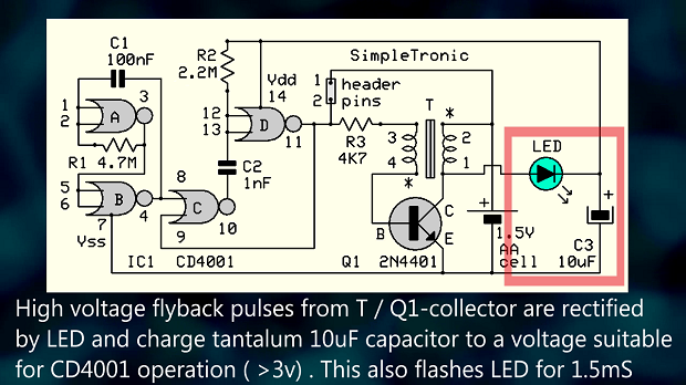 Схема представляет собой, по сути, «затворённый» блокирующий генератор (похититель джоулей). Микросхема CD4001 на микросхеме IC1 требует 3 В и не будет работать от 1,5 В (батарейка типа AA) при первом подключении. При кратковременном замыкании контактов 1-2 схема генерирует колебания, и на коллекторе транзистора Q1 появляются импульсы обратного напряжения. Эти импульсы выпрямляются светодиодом и заряжают конденсатор C3, при этом светодиод излучает свет. Теперь CD4001 питается от C3 достаточным напряжением питания и генерирует короткие импульсы (1,5 мс) с частотой 1 Гц (контакты отключены). Цикл повторяется до тех пор, пока не разрядится батарейка на 1,5 В.