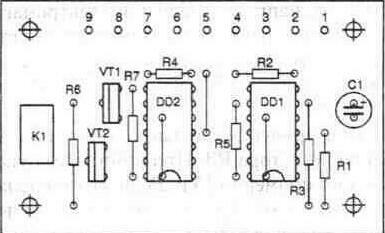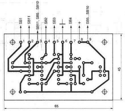 Печатная плата устройства выполнена из одностороннего фольгированного стекло текстолита размером 65х40 мм. Рисунок печатной платы приведен на рис. 6. 14. В качестве исполнительного устройства использовано реле РЭС-49. Размещение элементов на плате устройства приведено на рис. 6. 15. Микросхемы DD1, DD2 серии К561ТМ2 можно заменить без изменения рисунка печатной платы на микросхемы К176ТМ2. Резисторы R1 —R7 — типа МЛТ-0, 125 или им аналогичные. Конденсатор С1 нужно выбрать с возможно меньшим током утечки. Время набора устанавливают экспериментально, путем подбора номинала конденсатора С1. В качестве кнопок можно использовать любые, в том числе и от телефонного аппарата (кроме SB11).