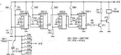 Устройство состоит из четырех RS-триггеров (две микросхемы К561ТМ2) DD1. 1, DD1. 2, DD2. 1, DD2. 2. Кнопки наборного поля располагаются с наружной стороны двери. Перед набором кода необходимо нажать кнопку SB11 «Сброс». Конденсатор С1 при этом быстро разряжается, а после отпускания кнопки он начинает медленно заряжаться от источника питания + 9 В через резистор R3. Пока напряжение на конденсаторе С1 не достигнет значения+ 4, 5 В и более, на входе S триггера DD1. 1 присутствует нулевой потенциал, который разрешает работу первого RS-триггера на элементе D1. 1.